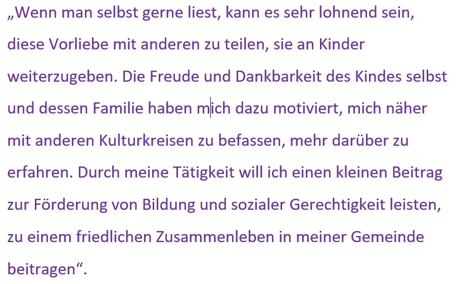 Eine ehrenamtliche Lesementorin trifft sich in der Regel mit einem Kind aus der Grundschule, übt mit ihm sowohl die Lesefertigkeit als auch das Leseverständnis, spornt in einer angenehmen Atmosphäre zum Zuhören und Selbst-Lesen an. Die Kinder genießen die volle Aufmerksamkeit eines Erwachsenen, stärken ihr Selbstbewusstsein, bekommen das Gefühl, dass sie etwas erreichen können, entdecken Freude am Lesen und werden in ihrer Sprachentwicklung wohlwollend begleitet.