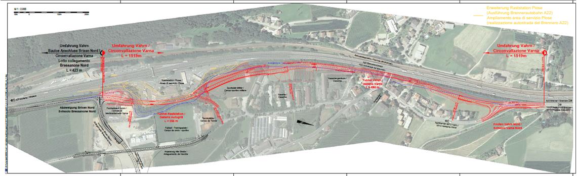 Il collegamento alla circonvallazione di Bressanone è previsto a Nord dello svincolo di Bressanone Nord. Il tracciato previsto si snoda per lo più parallelamente all’autostrada, in parte in galleria. La galleria “Plose” lunga 255 metri passerà al di sotto della stazione di servizio dell’autostrada, la galleria “Varna” di 590 metri consentirà l’accesso al centro di Varna. È previsto l’impiego di pareti fonoassorbenti nel tratto di circonvallazione compreso tra le due gallerie.
