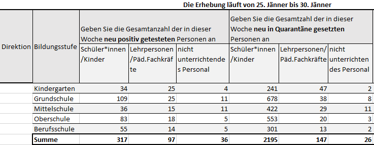 Nella settimana, tra il 25 e il 30 gennaio sono state registrate 450 nuove infezioni da Covid-19 nelle scuole in lingua tedesca dell'Alto Adige. Sono state inoltre collocate in quarantena preventiva quasi 2.509 persone. I numeri resi noti settimanalmente dalla Direzione istruzione e formazione tedesca includono l'intero corpo docente, il personale non insegnante, nonché bambini e ragazzi dalla scuola dell’infanzia alle scuole superiori.
