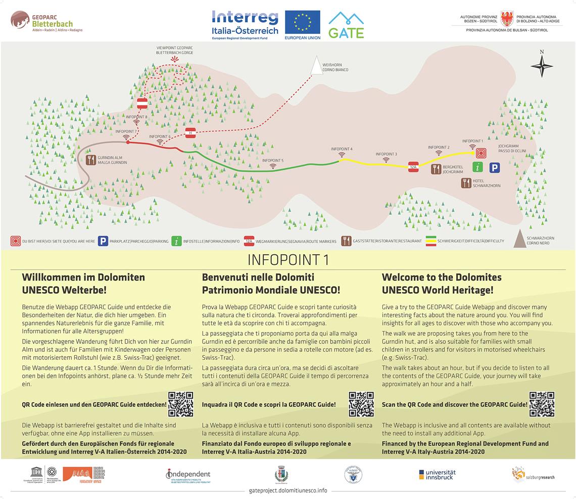 Grazie ad una nuova applicazione digitale “Geoparc Guide” i visitatori di tutte le fasce d’età possono ottenere spiegazioni ed informazioni adatte a loro percorrendo il sentiero tematico che porta al Patrimonio Mondiale con 8 infopoint digitali conduce dal Passo Occlini alla Malga Gurndin, adatto anche alle famiglie con passeggini e alle persone su sedia a rotelle motorizzata, della durata di circa 1,5 ore. Le guide sono disponibili in italiano, tedesco, inglese e nella lingua dei segni italiana LIS.