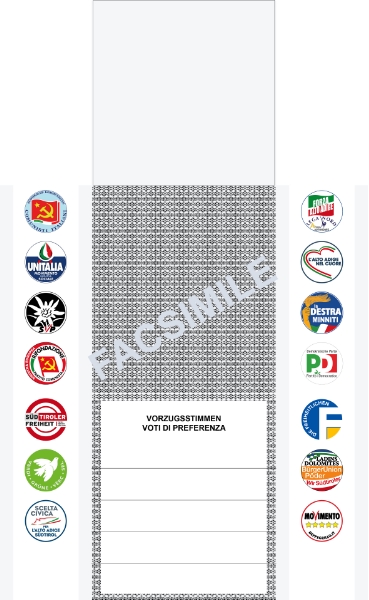 Nella scheda che al seggio sarà consegnata a ciascun elettore, dietro presentazione di certificato elettorale e documento di identità, è riprodotto il simbolo delle 14 liste in lizza, secondo l'ordine scaturito dal sorteggio effettuato lo scorso 26 settembre a Bolzano.