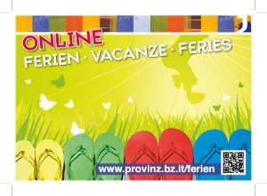 È stato ultimato in questi giorni il nuovo numero della guida “Summer 2014 – Ferien, Vacanze, Feries” a cura dell’Ufficio servizio giovani della Ripartizione cultura tedesca che offre una panoramica molto ampia e diversificata delle offerte estive per i più giovani. La guida è disponibile solamente online all'indirizzo www.provinz.bz.it/sommerferien.