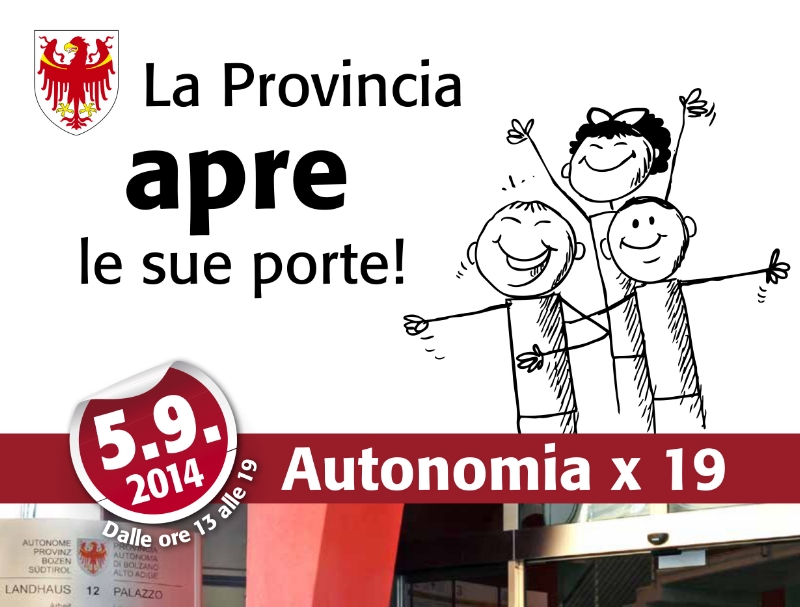 Prosegue il conto alla rovescia per la Giornata dell'autonomia, che sarà celebrata venerdì 5 settembre con un ricco programma di eventi nei palazzi della Provincia. Saranno ben 19 le location della giornata delle porte aperte su tutto il territorio, il cuore della festa sarà in Piazza Magnago, ma ci saranno iniziative anche a Merano, Bressanone, Egna, Brunico e Silandro.