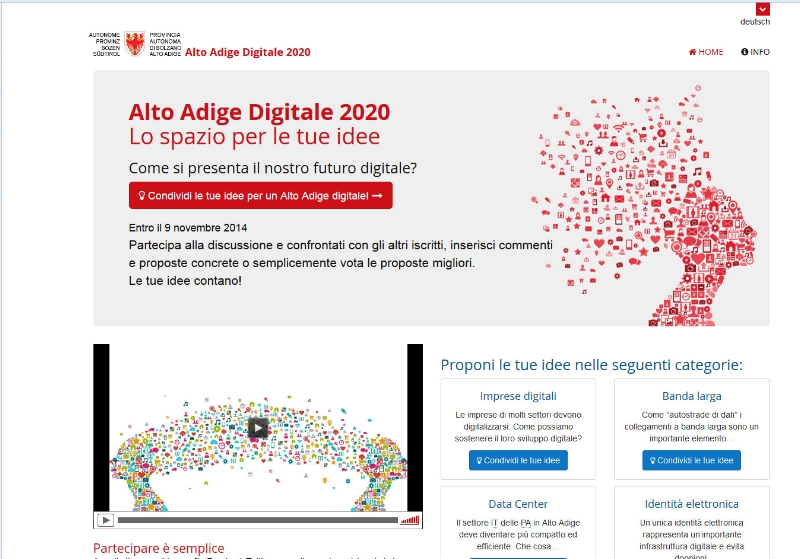 Alfredo Iellici di Informatica Alto Adige ha infine presentato il portale dell'Agenda Digitale aad2020.provincia.bz.it, un sito accessibile in maniera semplice e chiara, e strutturato secondo un certo numero di categorie. "Contiamo sulla maggior partecipazione possibile - ha concluso l'assessore Deeg - che ci consenta di elaborare un documento al quale dovranno fare seguito misure e interventi da applicare in maniera concreta per costruire un Alto Adige migliore e più moderno. Dal punto di vista dell'amministrazione, l'obiettivo è quello di diventare più rapidi, snelli e vicini alle esigenze e ai bisogni dei cittadini".