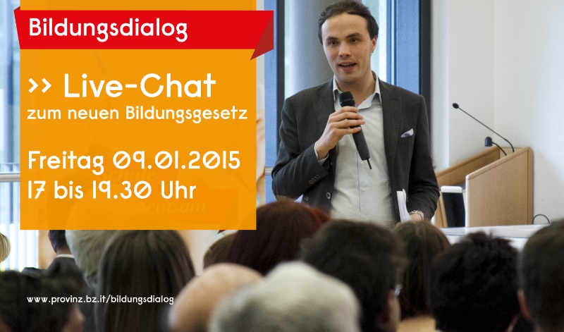 L'assessore alla scuola tedesca Philipp Achammer assieme all'Intendente scolastico tedesco Peter Höllrigl in una Live-Chat, in programma dalle ore 17.00 alle 19.30 del 9.01 al sito www.provinz.bz.it/bildungsdialog , sono a disposizione dei cittadini per rispondere alle loro domande, per uno scambio online di opinioni e per raccogliere suggerimenti per il disegno per la nuova legge sulla formazione