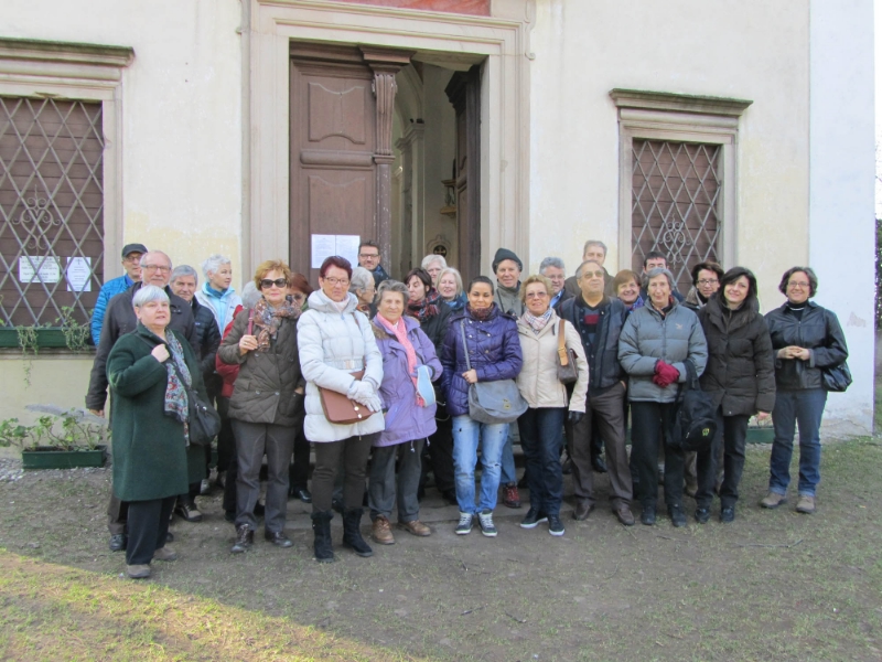Una trentina fra volontari e apprendenti del progetto Voluntariat per les llengües" sabato scorso 7.03 hanno partecipato alla visita guidata alle pendici del Virgolo alla Chiesa del Santo Sepolcro, alla Chiesa romanica di San Vigilio e quindi a Castel Flavon. Prima tappa la chiesetta del Santo Sepolcro, progettata dagli architetti Pietro e Andrea Delai nel 1684 in stile tardo barocco che sovrasta la città di Bolzano dalla balza rocciosa del Virgolo e che contiene affreschi del 1685 di Gabriel Kessler e Johann Hueber. Poi la piccola chiesa dedicata a S. Vigilio, che si trova poco più in alto costruita alla fine del XII ed infine Castel Flavon/Haselburg che sovrasta il quartiere di Aslago.