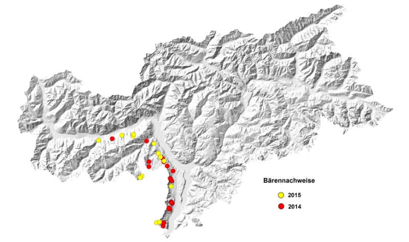 Il rapporto dell'Ufficio caccia e pesca relativo all'anno in corso, rileva sino ad oggi comportamenti simili ai periodi precedenti. Otto, infatti, gli episodi di attacchi ad animali domestici e alveari contro i nove del 2014 e i dodici dell'anno precedente. "Da ciò - spiegano Andreas Agreiter e Martin Stadler - si può evincere che il numero di esemplari presenti in maniera non continuativa sul territorio provinciale è compreso fra i due e i cinque". In Alto Adige viene segnalata la presenza di maschi provenienti dal vicino Trentino (dove il numero censito è di 50 con 7 cucciolate) attraverso la Mendola, la Val d'Ultimo e la Bassa Venosta. "Negli ultimi 10 anni - proseguono dall'Ufficio caccia e pesca - il numero di plantigradi che trascorrono parte della stagione in Alto Adige è oscillato fra i tre e i sette, mentre le femmine risultano stanziali in Trentino a causa della necessità di stare nelle immediate vicinanze dei propri cuccioli".