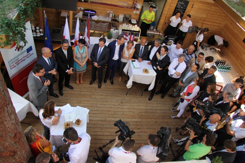 Presentarsi a livello nazionale e internazionale con i temi di punta che caratterizzano e garantiscono lo sviluppo duraturo e sostenibile dei tre territori alpini sul piano economico, ecologico e sociale: questo il senso della presenza dell'Euregio all'EXPO215, ribadita all'inaugurazione da Kompatscher e dai colleghi governatori Ugo Rossi e Günther Platter. Nella settimana della vetrina mondiale il GECT "Euregio Tirolo-Alto Adige-Trentino" vuole promuovere e comunicare valori, tematiche e progetti che caratterizzano l'area transfrontaliera del Tirolo storico e che fanno della sostenibilità alpina la chiave del successo dell'Euregio.