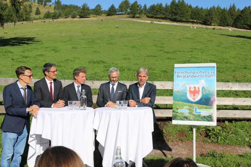 Il Progetto di ricerca per l'agricoltura montana e il piano d'azione 2016-2020 per la trasformazione alimentare è stato presentato dal presidente della Provincia Kompatscher assieme all'assessore all'agricoltura Schuler, al presidente della LUB Bergmeister e al direttore del Centro di sperimentazione agraria-forestale Laimburg, Michael Oberhuber, al maso "Stegerhof" a San Genesio.