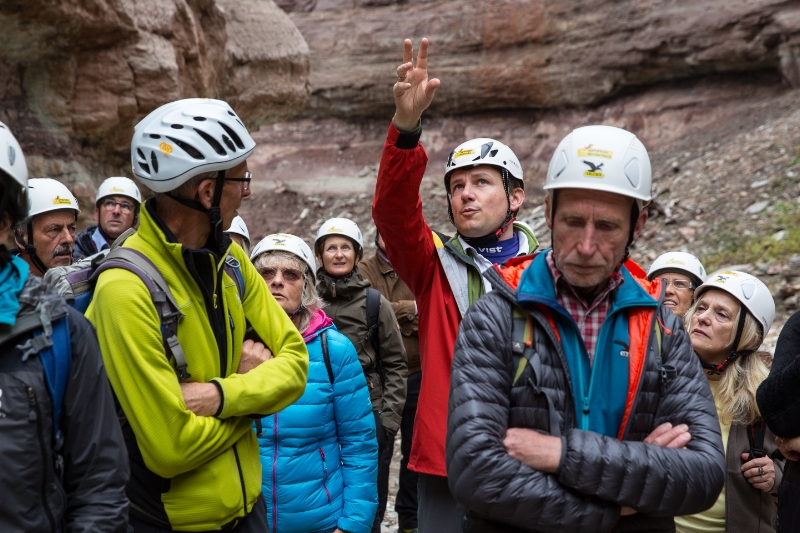 La visita al centro visite del Geoparc Bletterbach a Aldino e la successiva escursione si sono trasformate in un viaggio interessante attraverso milioni di anni di storia della terra, illustrati da Peter Daldos e Christian Weber, presidente e direttore del Geoparc che taglia il traguardo dei dieci anni di attività.
