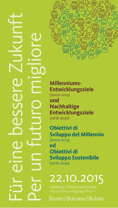 Su questa nuova Agenda 2030 e per trarre un bilancio sugli obiettivi di sviluppo del millennio, l'Ufficio Affari di gabinetto in collaborazione con Missio Bolzano un evento con brevi interventi e una tavola rotonda dal titolo "Per un futuro migliore - Obiettivi di Sviluppo del Millennio e Obiettivi di Sviluppo Sostenibile". I lavori saranno introdotti dal presidente della Provincia Arno Kompatscher assieme al vescovo Ivo Muser