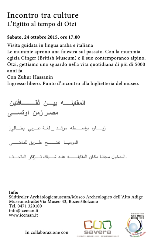 Sabato 24 ottobre si svolgerà una visita guidata al Museo Archeologico dell’Alto Adige in lingua araba ed in lingua italiana nel corso della quale saranno fatti interessanti confronti tra la mummia egizia denominata “Ginger” ed Ötzi. L’entrata al museo è gratuita per i partecipanti alla visita.