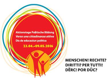 Le Giornate della Cittadinanza Attiva 2016 recano il titolo "Diritti? Per tutti!" e comprendono una sessantina di iniziative che varie organizzazioni ed enti propongono al pubblico tra aprile e maggio. Le manifestazioni si incentrano su temi quali democrazia, convivenza, diritti umani, migrazione. L'obiettivo, come spiega il direttore dell'Ufficio educazione permanente del Dipartimento cultura tedesca della Provincia, Hubert Bertoluzza, è quello di indurre le persone partecipanti alla riflessione per giungere ad una propria opinione su queste tematiche sulle quali confrontarsi con gli altri.