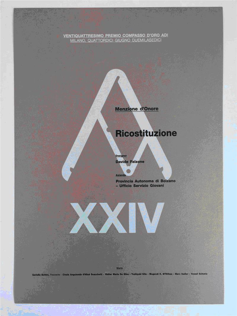 Al catalogo “Ricostituzione”, prodotto all’interno del Festival delle Resistenze contemporanee (edizione 2012) è andata la “Menzione d’onore”, riservata a quei prodotti del design italiano che si distinguono a livello internazionale per innovazione, qualità comunicativa e sostenibilità.