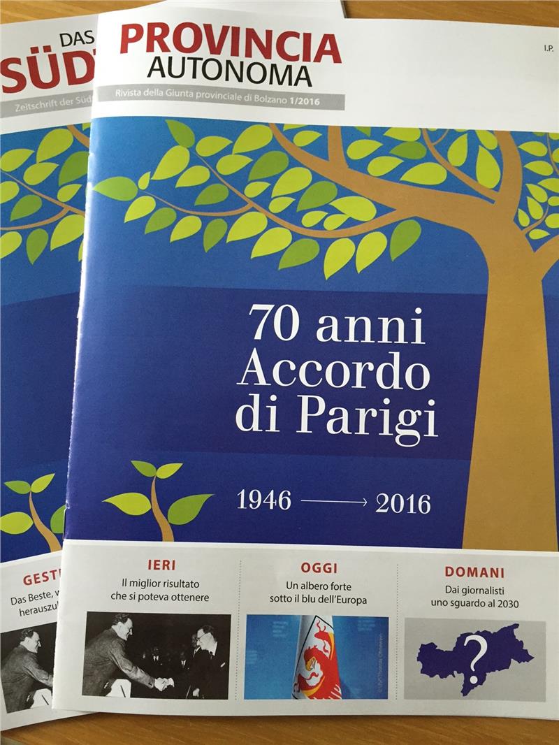 Il numero speciale della rivista della Giunta "Provincia autonoma" dedicato ai 70 anni dell'Accordo di Parigi (documenti e contributi di storici, docenti e giornalisti, foto dell'Alto Adige del dopoguerra e di oggi accompagnano il racconto di quell'Accordo, di come si è sviluppata l'autonomia e dei passi futuri) sarà nelle edicole sabato 30 luglio, veicolato con l’Alto Adige.