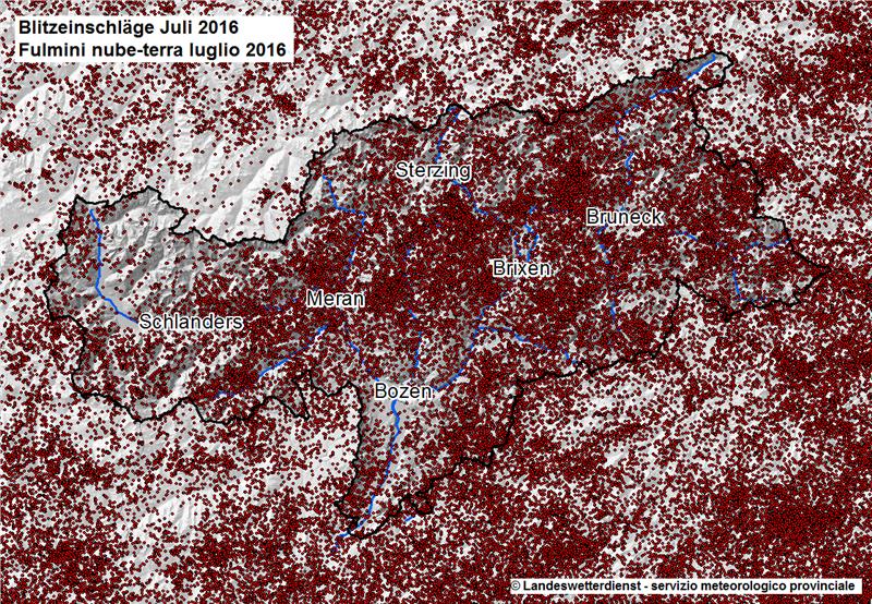 Puntuale, con la fine del mese, arriva anche il bilancio del Servizio meteorologico provinciale. Luglio è stato un mese relativamente caldo con alcuni picchi sia verso l'alto che verso il basso, ma ciò che prevale sono i fulmini. "Il nostro sistema di monitoraggio - sottolinea il meteorologo provinciale Dieter Peterlin - ha registrato ben 30.800 fulmini nel corso mese appena concluso: si tratta del valore più alto registrato negli ultimi cinque anni". Il record, naturalmente, è stato registrato nella serata di sabato 30 luglio, con ben 7.500 fulmini su tutto il territorio altoatesino. Questa attività legata ai temporali va a braccetto con i dati sulle precipitazioni: anche questi pongono il luglio 2016 sopra la media. Solo nella zona di Bolzano si rilevano precipitazioni stabili, mentre nel resto della Provincia si va dal +10% di Silandro al +80% di Merano.