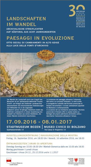 L'ampia panoramica di fonti scritte e iconografiche esposte, come ha detto l'assessore Mussner, connota l'esposizione illustra le diverse sfacettature dello sviluppo del territorio altoatesino nel corso di otto secoli. Già trent'anni fa si riconobbe come il paesaggio naturale, unico nel suo genere, appartenesse al carattere dell'Alto Adige, di cui ha contribuito a forgiare la storia. Tramite l'esposizione l'Archivio provinciale fa fede nuovamente al suo ruolo nel conservare e tramandare la storia e con essa le radici e l'identità degli altoatesini.
