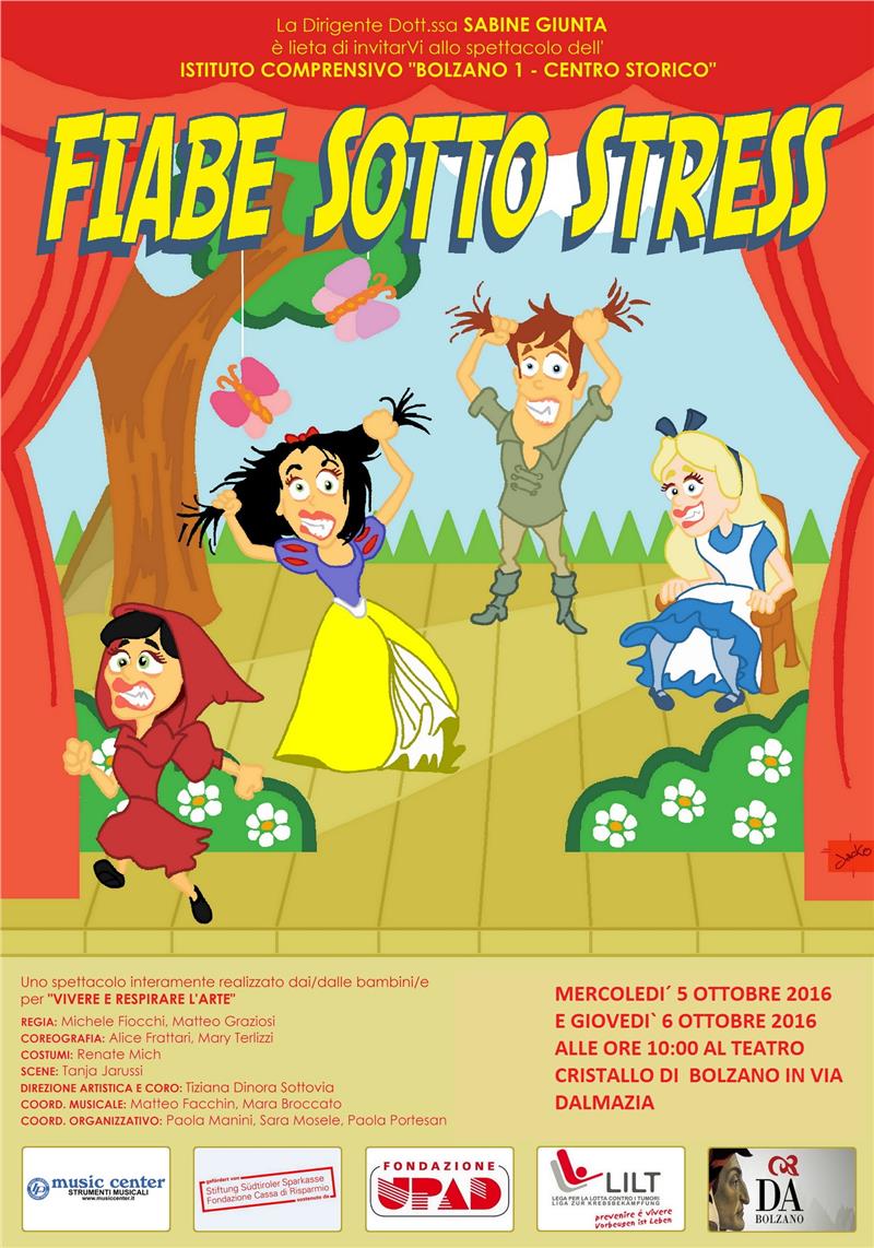 Lo spettacolo "Fiabe sotto stress" è interamente realizzato dalle bambine e dai bambini delle scuole primarie con potenziamento musicale dell' Istituto Comprensivo Bolzano 1 - Centro Storico in collaborazione con la Scuola di Musica “Antonio Vivaldi”, l' UPAD e con il patrocinio della Sovrintendenza scolastica per le scuole di lingua italiana.