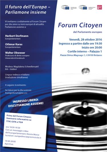 A seguire, alle ore 20, è fissato un appuntamento con il "Forum Citoyen" del Parlamento europeo per coinvolgere i cittadini nella discussione sul futuro dell’Europa. Alla tavola rotonda parteciperanno l’europarlamentare altoatesino Herbert Dorfmann, l’europarlamentare austriaco Othmar Karas e il professor Walter Obwexer. Al termine si terrà il dibattito con il pubblico.