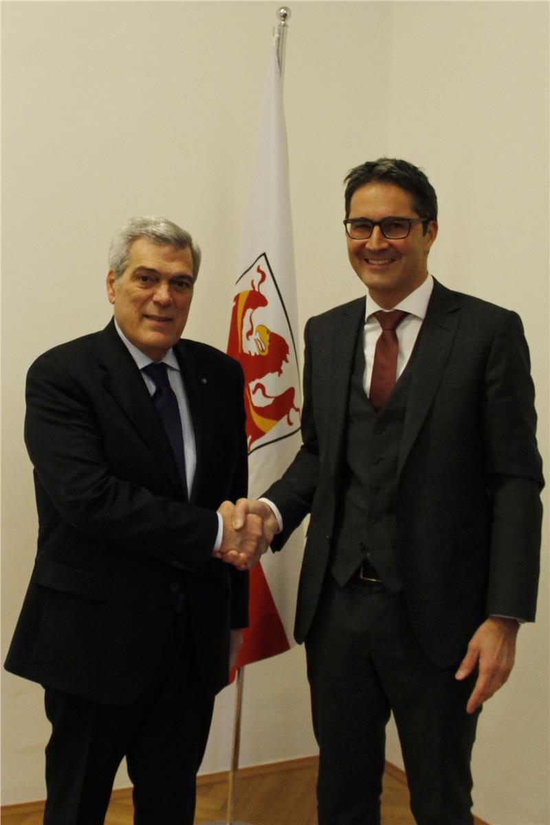 Visita di commiato a Palazzo Widmann per il quasi ex questore di Bolzano, Lucio Carluccio. Kompatscher l'ha ringraziato per l'ottima collaborazione