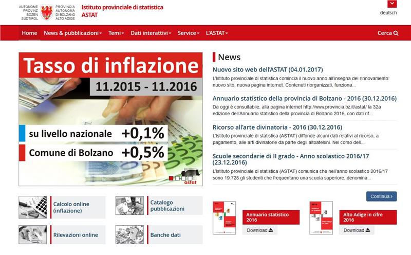 Altra novità, oltre a quella legata al direttore, è poi l'aggiornamento della presenza sul web. E' infatti online da qualche giorno il nuovo portale ASTAT, raggiungibile all'indirizzo astat.provincia.bz.it, che rientra nel più ampio progetto di ammodernamento della presenza internet della Provincia di Bolzano. Il portale si caratterizza per chiarezza, semplicità e facilità di navigazione con tutti gli strumenti (pc, tablet, smartphone), e mette a disposizione degli utenti un grande numero di dati e rilevazioni. Particolarmente interessante l'atlante statistico, una vera e propria mappa interattiva dell'Alto Adige che consente di visualizzare al meglio dal punto di vista grafico l'evoluzione della nostra Provincia per quanto riguarda popolazione, famiglie e turismo.