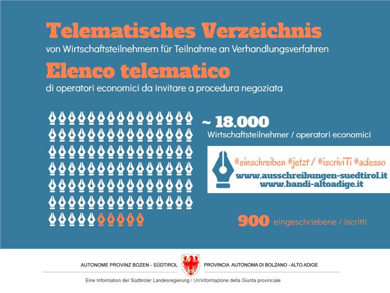 Strumenti particolarmente importanti del sistema complessivo che permetterà di acquistare prodotti e servizi in modo più efficiente sono l’ampio indirizzario degli operatori economici con oltre 18mila iscrizioni e il nuovo registro telematico degli operatori economici, da luglio presente sul portale degli appalti della Provincia e che conta al momento circa 900 imprese registrate. Il registro è il punto di riferimento per le procedure di gare negoziate: le imprese interessate si possono registrare nell’elenco telematico nelle categorie in cui desiderano essere invitate dall’ente pubblico alla procedura negoziata (forniture, servizi, costruzioni). In questo modo i 500 enti appaltatori presenti in Alto Adige hanno uno strumento che consente di utilizzare filtri come quelli presenti sulle Pagine gialle e vedere facilmente quali sono le imprese che forniscono determinati prodotti e servizi. Il nuovo elenco telematico rappresenta quindi una semplificazione procedurale essenziale: da un lato per le stazioni appaltanti diventa più semplice l’affidamento di incarichi, dall’altro genera nuove possibilità per ogni operatore economico, che accede agli appalti pubblici quando è in grado di fornire le prestazioni richieste, nel senso di una gara trasparente.