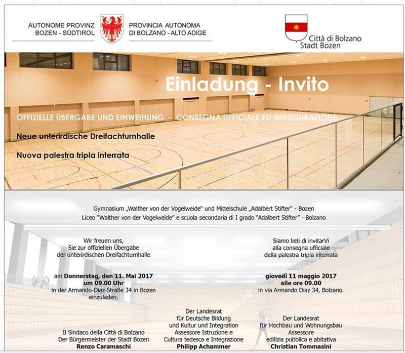 La nuova palestra potrà essere utilizzata sia dagli alunni del Liceo Classico in lingua tedesca "Walther von der Vogelweide" che da quelli della scuola secondaria di I grado in lingua tedesca"Adalbert Stifter". I lavori di costruzione, seguiti dal Dipartimento Edilizia Pubblica della Provincia sono stati portati a termine nel febbraio 2017.