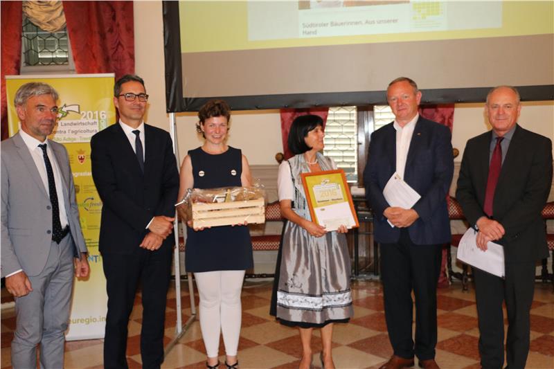 E' stato assegnato alle 65 contadine del progetto "Dalle nostre mani" il premio del concorso Euregio "Il turismo incontra l’agricoltura" promosso con l’obiettivo di rendere visibile la cooperazione tra i due comparti. Premiati anche il Centro di formazione professionale di Tesero e una malga in Tirolo. Alla cerimonia di consegna che si è tenuta stamani (26 maggio) a Palazzo Mercantile erano presenti il presidente Arno Kompatscher, l’assessore Arnold Schuler, il vicepresidente e assessore all’agricoltura, Josef Geisler, e dal dirigente della Provincia di Trento Giuseppe Bax in rappresentanza dell’assessore Michele Dallapiccola.