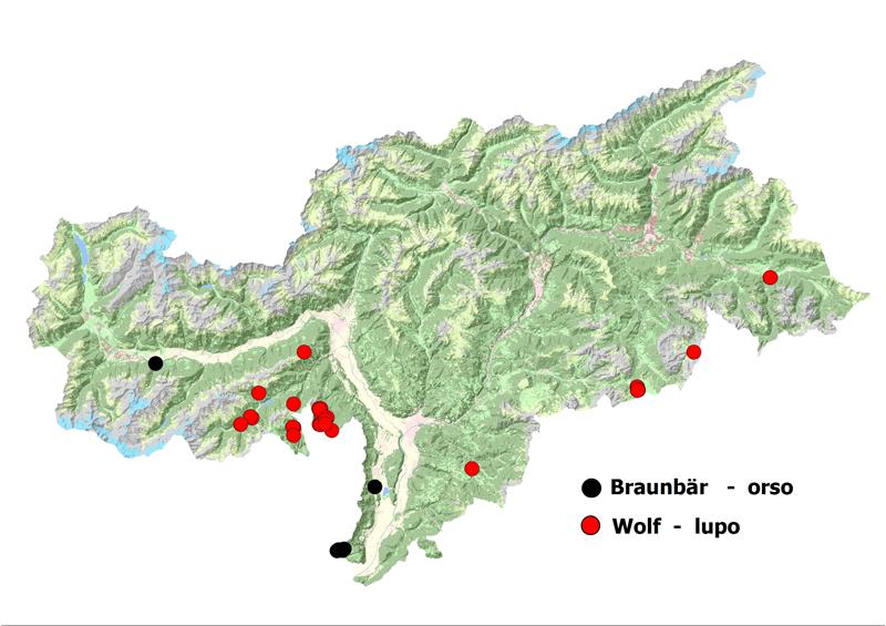 La presenza di lupi e orsi nel territorio provinciale è in aumento. Una mappa realizzata dall'Ufficio caccia e pesca rende facilmente individuabili le aree in cui sono stati effettuati gli avvistamenti o rilevate le tracce. Il tema è di quelli che suscita emozioni ma è anche fonte di preoccupazione, in primo luogo per gli allevatori. La Provincia ha quindi deciso di istituire un servizio di consulenza e di adeguare le norme sui risarcimenti alle prescrizioni dell'Ue. "Il rapporto dell’uomo con i grandi predatori è una sfida, la gestione del fenomeno è responsabilità di tutti", afferma l’assessore Arnold Schuler. “La presenza del lupo in Alto Adige è destinata ad aumentare - aggiunge - quindi è importante valutare il rischi per il bestiame e creare un piano di gestione del fenomeno per l'intera provincia". Nell’Ufficio economia montana della Ripartizione provinciale foreste (Palazzo 6, via Brennero 6) è stato di recente attivato un Servizio di consulenza per la protezione delle greggi in cui il vice direttore Emilio Dallagiacoma e Konrad Pfattner sono a disposizione per fornire informazioni e assistenza agli allevatori.