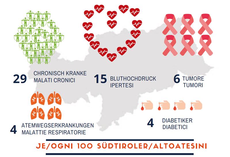 Ancora alta l’ospedalizzazione per patologie croniche rispetto all’Italia, ma significativamente più bassa rispetto a Paesi come Germania e Austria. 100 ricoveri ogni 1000 abitanti per malattie respiratorie croniche 61 per diabete. Il 29% della popolazione è affetto almeno da una patologia cronica (pari a circa 153.000 persone) e assorbe il 70% delle risorse spese in prestazioni sanitarie. Il 15% è iperteso, 4% sono diabetici , 6% sono le persone affette da tumore e 4% sono i malati di broncopatia cronico ostruttiva.