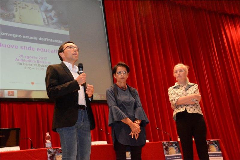 Nel corso del suo saluto l’assessore alla scuola ha anche rivendicato “la qualità della nostra offerta formativa basata sul sistema pedagogico italiano, che ha un livello di eccellenza assoluta, indubbiamente di serie A”. Rispetto al modello plurilingue e ai timori di una parte degli insegnanti che l’aver imboccato questa direzione possa nel medio lungo termine ridurre le cattedre di lingua italiana, l’assessore ha chiarito che “questo modello si sviluppa grazie al fatto che negli anni abbiamo formato personale di lingua italiana all’insegnamento ludico del tedesco e dell’inglese, per cui il potenziamento avviene utilizzando risorse interne. Quest’anno, per dire, a questo scopo abbiamo inserito tre nuovi insegnanti di lingua italiana molto ben preparati, ed essi si andranno ad integrare in un modello che continuerà a prevedere anche personale di madrelingua.”