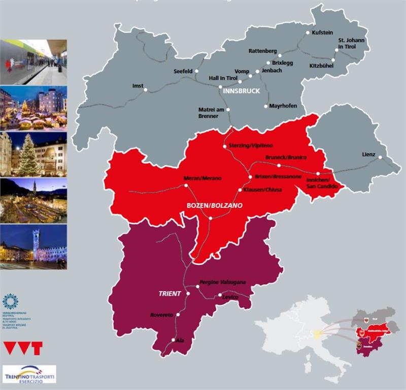 La possibilità di viaggiare gratuitamente sarà attiva in Provincia di Bolzano su tutti i mezzi pubblici del Trasporto integrato Alto Adige, ovvero treni regionali in servizio lungo la linea del Brennero, della Val Venosta e della Val Pusteria, nonchè sui bus di linea urbani ed extraurbani. Per quanto riguarda il Tirolo, si potranno utilizzare bus e treni di Verkehrsverbund Tirol (VVT) e Innsbrucker Verkehrsbetriebe (IVB), mentre in Trentino saranno coinvolti i seguenti servizi: linea ferroviaria del Brennero fra Borghetto e Mezzocorona, linee ferroviarie Trento-Malè e Valsugana (fra Trento e Primolano), bus extraurbani di Trentino Trasporti, bus urbani di Trento, Rovereto, Riva del Garda, Arco, Nago Torbole, Pergine e Lavis, funivia Trento-Sardagna. Sabato 2 dicembre potranno viaggiare gratuitamente solo i passeggeri, mentre tutti i servizi aggiuntivi come trasporto biciclette, animali e Nightliner dovranno essere regolarmente pagati.