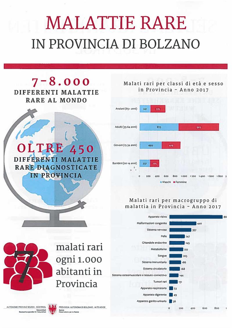 Secondo l’Organizzazione mondiale della salute, le malattie rare a livello planetario sono circa 8mila, l’80-90% delle quali ha origini genetiche. In Europa questa problematica coinvolge tra i 27 ed i 36 milioni di persone, in Alto Adige l’anno scorso si sono registrati complessivamente 3.714 pazienti affetti da 450 diverse malattie rare, con un’età media di 42 anni. Le più frequenti sono il cheratocono, la carenza congenita di alfa-1 antitripsina, il Lichen Sclero-Atrofico e le neurofibromatosi. A livello di macrogruppi aggregati, le patologie più diffuse negli anni sul nostro territorio sono quelle dell’apparato visivo (che raggruppano oltre 20 malattie rare differenti tra cui il cheratocono), le malformazioni congenite (che raggruppano oltre 110 malattie rare differenti, come la sindrome di Arnold-Chiari, le anomalie congenite del cranio e delle ossa della faccia) e le malattie rare del sistema nervoso centrale e periferico (che raggruppano oltre 70 malattie rare differenti, tra cui miastenia, sclerosi laterale amiotrofica, nota anche come SLA, e Corea di Huntigton).