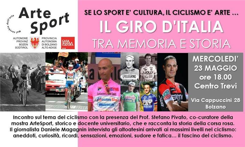 "Il Giro d’Italia tra memoria e storia". Questo è il titolo dell’evento in programma mercoledì 23 maggio alle ore 18 al Centro Trevi, nell’ambito di Arte Sport. Il professor Stefano Pivato, co-curatore della mostra Arte Sport, storico e docente universitario, racconterà la storia della corsa rosa, mentre il giornalista Daniele Magagnin intervisterà ciclisti altoatesini arrivati ai massimi livelli, rivelando aneddoti, curiosità e ricordi. Alla serata parteciperanno: Manuel Quinziato, campione italiano a cronometro, campione mondiale nella crono a squadre, grande protagonista del ciclismo italiano fino a due anni fa, oggi, dopo la laurea in giurisprudenza, procuratore nel settore; Claudio Camin, oggi 48enne, professionista per 4 anni ed imprenditore nel settore; Cristian Zanolini, professionista per tre anni, compagno di squadra e amico di Marco Pantani, anch'egli imprenditore nel settore delle biciclette; Renato Marchetti, classe 1947, professionista per otto anni al fianco di Francesco Moser, del quale è stato gregario; Bruno Brasolin, oggi ottantenne, professionista per due anni tra il 1962 e il 1963, imprenditore nel settore auto e bici elettriche.