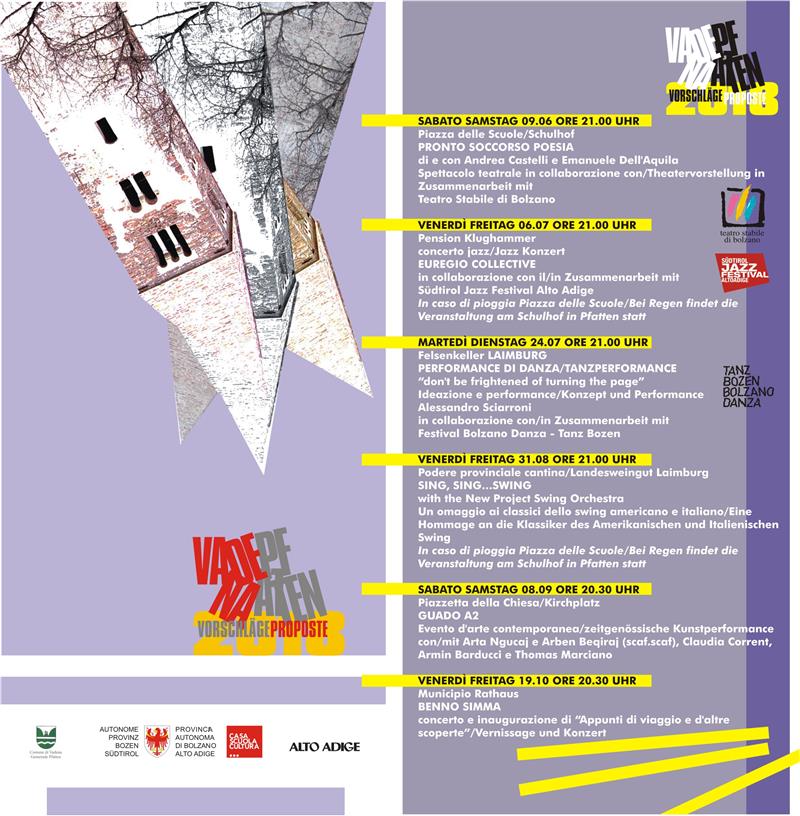 Per il 2018 l’offerta si amplia con sei spettacoli in sei location differenti. Il programma si apre sabato 9 giugno alle ore 20.30 nel piazzale delle scuole di Vadena con un evento in collaborazione con il Teatro Stabile di Bolzano. Lo spettacolo è “Pronto soccorso poesia” di e con Andrea Castelli e Emanuele Dell'Aquila. Si prosegue venerdì 6 luglio alle ore 21 nella frazione Klughammer con il concerto Jazz in collaborazione con il Südtirol Jazz Festival Alto Adige. Terzo appuntamento è al Felsenkeller (cantina nella roccia) presso la localitá Laimburg con una performance di danza in collaborazione con il Festival Bolzano Danza. Si prosegue venerdì 31 agosto alle ore 21 nella cantina di Laimburg con lo Swing della New Project Swing Orchestra, rivisitazione in chiave swing e jazz di brani della grande tradizione. Sabato 8 settembre alle 20.30 nella Piazzetta della Chiesa a Vadena è in calendario Guado A2 A2, evento d'arte contemporanea. Vadena Proposte si conclude venerdì 19 ottobre alle 20.30 al Municipio di Vadena con il concerto e l’inaugurazione di “Appunti di viaggio e d'altre scoperte” del musicista-artista Benno Simma.