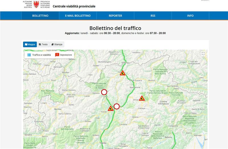 Cercate informazioni sempre aggiornate, 365 giorni all'anno, sulla situazione della viabilità in Alto Adige? Limitazioni al traffico, code, incidenti, cantieri, passi di montagna, controlli radar: da oggi tutte queste informazioni sono a disposizione sul nuovo portale web della Centrale viabilità provinciale all'indirizzo traffico.provincia.bz.it. Tra le novità, la possibilità di trovare le informazioni relative alle chiusure delle piste ciclabili presenti sul territorio altoatesino. Il portale web, che è online da questa mattina (7 agosto), può contare su un potente motore di ricerca che rende più semplice e rapido trovare i contenuti richiesti, e su un design responsive che adegua automaticamente la visualizzazione allo strumento con il quale si sta navigando (pc, tablet, smartphone, ecc.). Altra importante novità, la presenza di una mappa Google interattiva con tutte le informazioni sul traffico e la viabilità in Alto Adige che consente agli utenti di geolocalizzarsi e di valutare la situazione nella immediate vicinanze o lungo il percorso che si intende compiere.