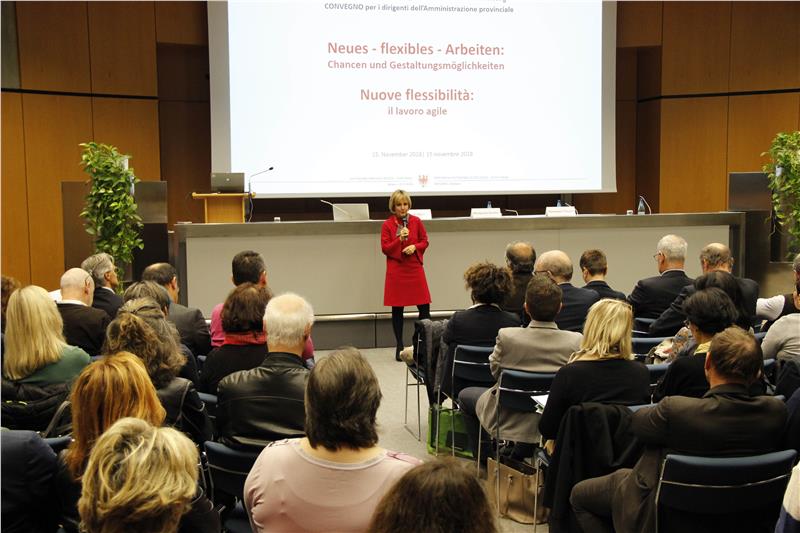 L’assessora ha quindi esortato i dirigenti presenti al convegno ad operare allo scopo di creare una nuova cultura dirigenziale. In quest’ambito, ha proseguito, la flessibilizzazione del lavoro richiede una delega di responsabilità e di fiducia, ma anche il raggiungimento degli obiettivi prefissati. La Provincia sta già lavorando alla realizzazione di un concreto progetto di partnership tra pubblico e privato allo scopo di introdurre il cosiddetto “smart working” anche nell’ambito della pubblica amministrazione. La maggior parte dei 150 dirigenti presenti al convegno ha definito “molto importante” il modello di lavoro flessibile. I principali vantaggi del modello di “lavoro agile” vengono identificati nella maggiore conciliabilità tra la famiglia ed il lavoro e nella maggiore attrattività del posto di lavoro.
