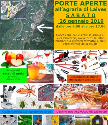 La Scuola agraria di Laives apre i battenti sabato 26 gennaio dalle 9 alle 17 per dare l’occasione a tutti gli interessati di visitare la scuola e suoi laboratori e per avere tutte le informazioni sui percorsi formativi e sulle varie attività dell'istituto. Nel corso della giornata delle porte aperte i visitatori avranno la possibilità di assaggiare il succo di mela prodotto dalla scuola, apprendere curiosità attraverso l’uso dello stereomicroscopio e vedere le attrezzature a disposizione della scuola. La scuola agraria ha sede in via Rio Vallarsa, 16 a Laives.