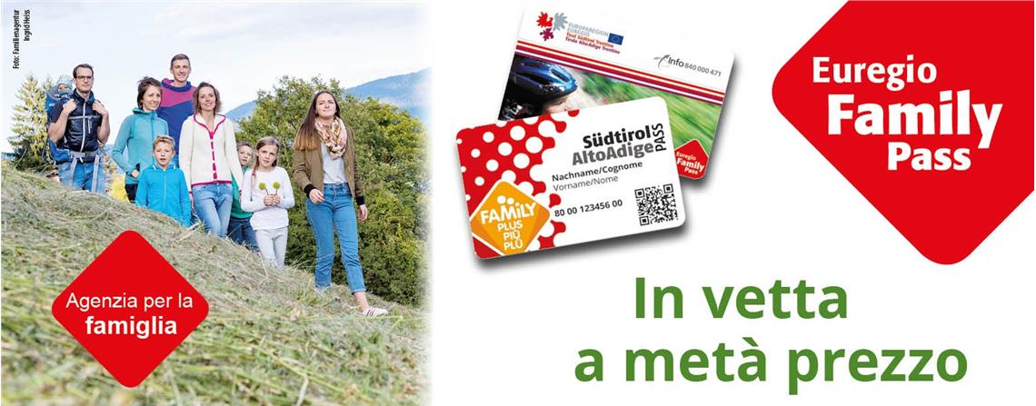 "Con Euregio FamilyPass vogliamo offrire sostegno concreto alle famiglie altoatesine - commenta l'assessora provinciale Waltraud Deeg - e dare visibilità e importanza a strutture e aziende che partecipano attivamente ai progetti. Per questo motivo mi auguro che il maggior numero possibile di famiglie riesca ad aderire a questa iniziativa e a sfruttare gli sconti su funivie e seggiovie per effettuare delle escursioni in montagna". A partire da questo week-end (orari, giornate e impianti aderenti nel flyer allegato) prende dunque il via l'iniziativa promossa dall'Agenzia per la famiglia in collaborazione con l'associazione esercenti funiviari dell'Alto Adige che consente alle famiglie di tutti e 3 i territori dell'Euregio di utilizzare una serie di seggiovie, cabinovie e funivie a metà prezzo.