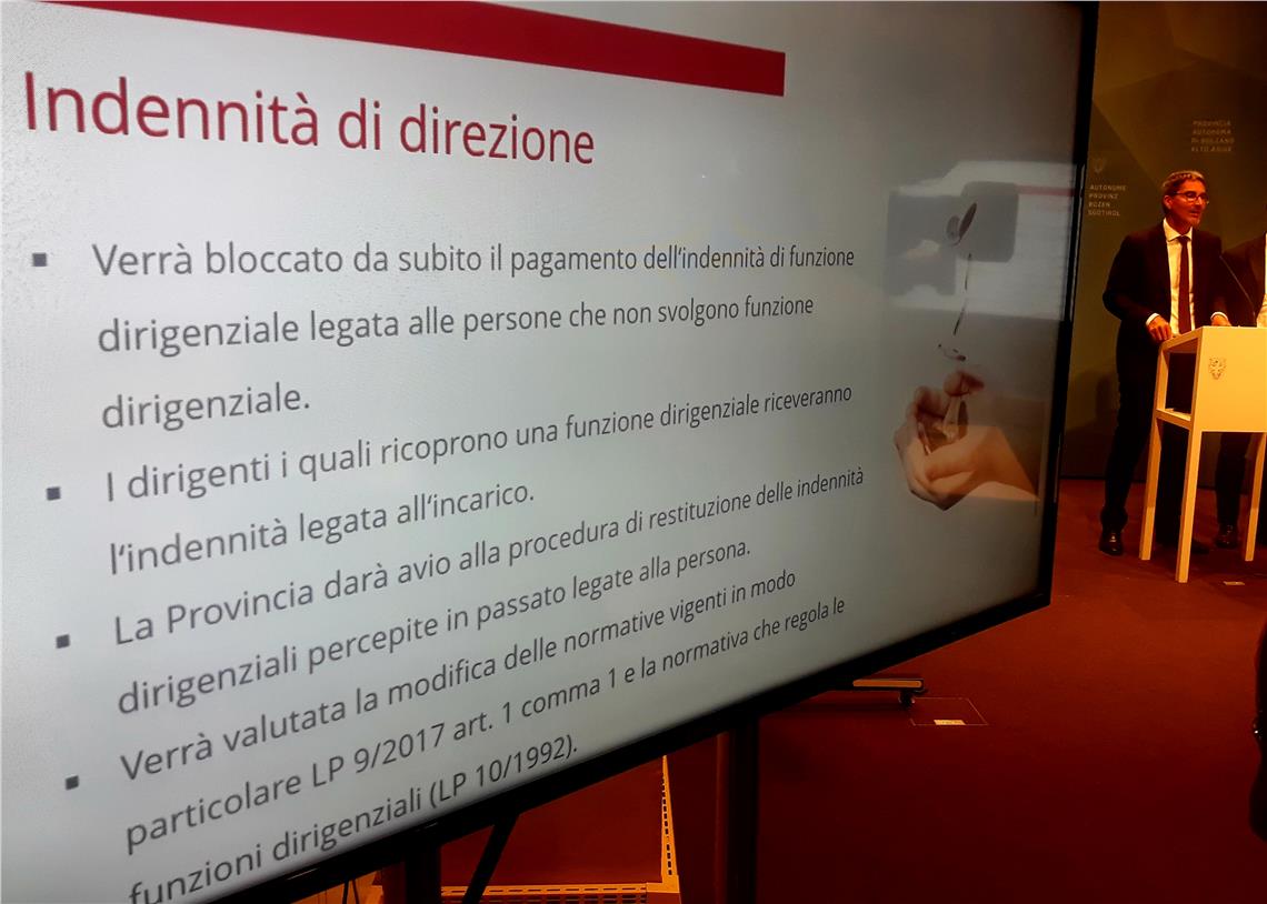 "Purtroppo - ha spiegato Kompatscher - i funzionari dovranno restituire queste somme pur non avendo alcuna colpa, e mi sento di dire che neppure coloro che hanno pagato queste indennità hanno colpe specifiche, in quanto hanno applicato leggi e accordi collettivi che erano in vigore e solo ora sono stati dichiarati incostituzionali. Apriremo un confronto con ogni singolo dipendente interessato da questo provvedimento, e prevederemo la possibilità di suddividere il pagamento in rate".