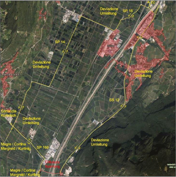 Chiusura programmata da lunedì 17 febbraio per la strada provinciale SP20 nel tratto fra San Floriano e Magrè. La chiusura al traffico, della durata di un mese, si è resa necessaria per consentire lo svolgimento di lavori urgenti e indifferibili di messa in sicurezza delle protezioni laterali del sovrappasso autostradale in località San Floriano. La riapertura della strada è prevista per il prossimo 20 marzo. I lavori sono stati commissionati dalla società Autostrada del Brennero alla ditta Dalprà Giovanni di Roncegno Terme (TN). Le deviazioni al traffico verranno segnalate con apposite tabelle in loco e avverranno seguendo da sud verso nord il percorso della SS 12 del Brennero per poi dirigersi verso l'uscita dell'Autostrada Egna/Ora, attraversare l'Adige e l'autostrada stessa sulla SP 16. La deviazione condurrà a proseguire poi verso sud in direzione Termeno, Cortaccia, Magrè, Cortina lungo la SP 14 di fondovalle e viceversa.