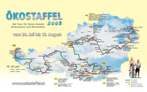 Bereits im vergangenen Jahr wurde eine Sternfahrt zur Ökostaffel organisiert, heuer führt die Tour erstmals direkt durch Südtirol. Am Mittwoch, 10. August, erreichen die Teilnehmer der Ökostaffel den Brenner und gelangen über die Stationen Sterzing und Vahrn zum Etappenort Brixen. Am Donnerstag geht die Tour mit den umweltfreundlichen Fortbewegungsmitteln über Klausen, Waidbruck, Kardaun, Bozen und Gargazon weiter nach Meran, ehe am Freitag die Töll, Naturns, Latsch, Mals und Reschen die letzten Stationen auf Südtiroler Boden sind. Zur Stärkung gibt es bei den einzelnen Haltestellen fair gehandelte Produkte und Bioerzeugnisse von Bauern aus der Region. Darüber hinaus wird an den Stationen auch über die Anliegen der Ökostaffel informiert. Passend zum Internationalen Jahr des Sports zeigt das Landesamt für Sport in Zusammenarbeit mit der Dienststelle für Entwicklungszusammenarbeit der Landesverwaltung an den Etappenorten Brixen, Klausen, Bozen, Meran und Latsch eine Ausstellung zum Thema "Sport - globales Spiel" .