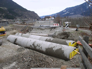 Mit gutem Grund: "Die Brücke führte bisher über einen Kanal, durch den im Falle eines Etschhochwassers Wasser in ein Auffangbecken geleitet werden sollte", so Mussner. Durch die stetige Anhebung der Flächen zwischen Etsch und Straße ist dies allerdings nicht mehr möglich. "Sicherheitshalber haben wir jedenfalls zwei Rohre mit einem Durchmesser von je einem Meter eingezogen, durch die notfalls Wasser abgeleitet werden kann", so Mussner. Die beiden Rohre wurden dieser Tage mit Erde bedeckt und über diese Aufschüttung wird künftig die Zufahrt nach Goldrain verlaufen.