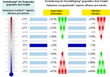 Hinsichtlich der Lufttemperatur haben die Werte zwischen März und Mai einen hohen Einfluss auf das Beschäftigungsniveau im September und Oktober. Die saisonale Beschäftigung in der Landwirtschaft verzeichnet dabei im September tendenziell eine zyklische und im Oktober eine antizyklische Entwicklung im Verhältnis zur Temperatur im Frühjahr. Dies bedeutet, dass in der Regel einer höheren Temperatur eine höhere Beschäftigung im September und eine geringere im Oktober entsprechen.