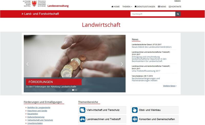 Unter der Webadresse http://www.provinz.bz.it/land-forstwirtschaft finden interessierte Bürgerinnen und Bürger alle für die Landwirtschaft relevanten Themen auf einen Blick, wie Viehwirtschaft und Tierschutz, Landmaschinen und Treibstoff, alles Wissenswerte rund um den Bauernhof, Biologische Landwirtschaft, Obst- und Weinbau, Konsortien und Gemeinschaften, den Agrarbetrieb Laimburg u.a.m. Leicht zugänglich sind auch alle Fördermaßnahmen des Landes, die EU-Entwicklungsprogramme sowie die Agrarberichte und News.