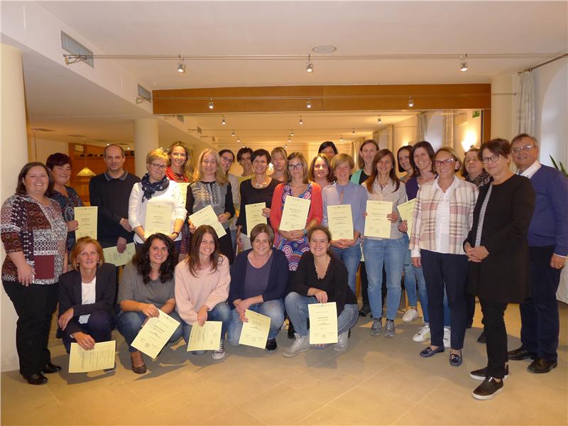 Eineinhalb Jahre dauerte die "Kursfolge Schulbibliothek: Leseförderung und Bibliotheksdidaktik", die 45 Lehrerinnen und Schulbibliothekarinnen der Grundschule mit Oktober 2018 abgeschlossen haben. Aufgeteilt auf zwei Gruppen bestritten die Lehrpersonen 134 Stunden an Fortbildung. Sie lernten dabei unter anderem, wie ein Bibliotheksteam optimal arbeitet, wie Bibliotheksarbeit mit dem Dreijahresplan verknüpft wird oder wie ein Bestandskonzept den Bestandsaufbau optimiert. Auch die lesefördernden Aktivitäten waren Lehrgangsinhalte. Sie sollten vielfältig sein, um Leseratten und leseschwache Schüler gleichermaßen zu erreichen. In ihren Abschlussarbeiten überraschten die Absolventinnen mit sehr innovativen, vielfältigen und kreativen Beispielen, wie die beiden Kursleiter, Mathilde Aspmair von der Pädagogischen Abteilung und Markus Fritz vom Amt für Bibliotheken und Lesen betonten.