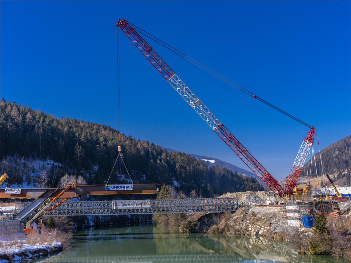 "Mit diesen Arbeiten nimmt die Brücke nun Gestalt an. Die Installation ist eine komplizierte technische Prozedur, der aufwändige Planungs- und Projektierungsarbeiten vorausgehen", sagt Alfreider. In der Tat ist für das Anbringen der etwa 80 Meter langen Stahlträger ein fast 90 Meter hoher und 300 Tonnen schwerer Kran, der bis zu 600 Tonnen heben kann, im Einsatz. Die Stahlteile der Brücke werden vom Unternehmen Cimolai angebracht.