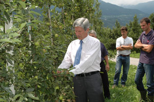 Beim Ortsaugenschein mit Bauernvertretern aus Lana und Gargazon sowie Mitarbeitern des Beratungsringes für Obst- und Weinbau hat Berger das vom Hagelschlag betroffene Gebiet im Etschtal besichtigt.