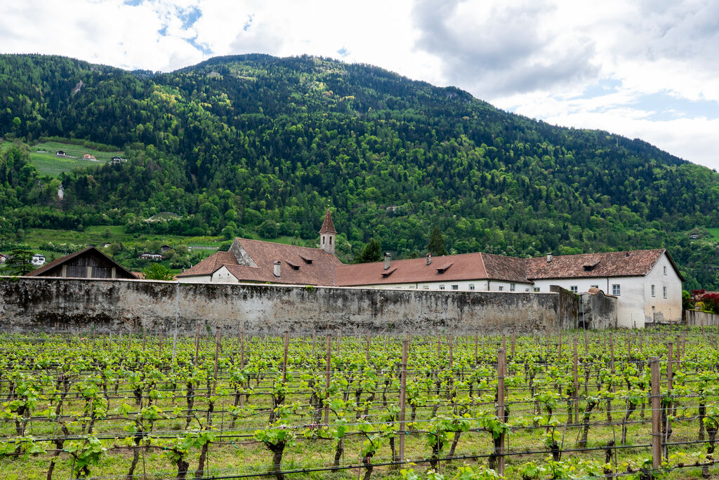 Gegründet um 1243 von den Töchtern des letzten Grafen von Tirol. Kreuzgang, spätgotische Kirche. Das ehemalige Noviziat (Bp. 96) und andere Nebengebäude heute in Privatbesitz. Klosterkirche mit geradem Chorschluß, Kreuzgratgewölbe, Dachreiter mit Pyramidendach, Fresken ober dem Sterngratgewölbe, zweite Hälfte 14. Jh. und frühes 15. Jh. Kreuzgang mit Kreuzgratgewölben, Triforienöffnungen.