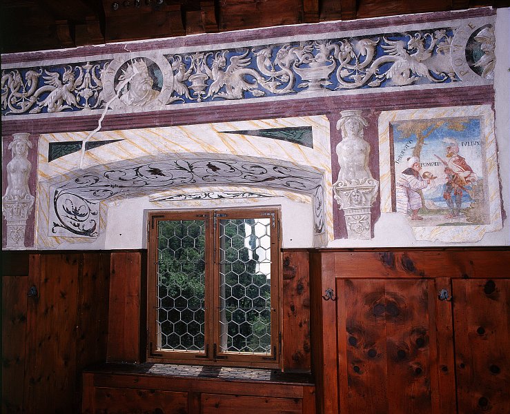 Im 13. Jahrhundert erbaut, im 16. Jh. erneuert, teilweise Ruine. Rundbogentor mit Wappenfeld, an der Südseite zweigeschossiger Viereckerker auf Kragsteinen. Im ersten Stock Zimmer mit Gemäldefries (römische Historien, Kaiserbilder, Wappen Völs Colonna), bez. 1541. Im zweiten Stock Szenen aus Ovids Metamorphosen.
